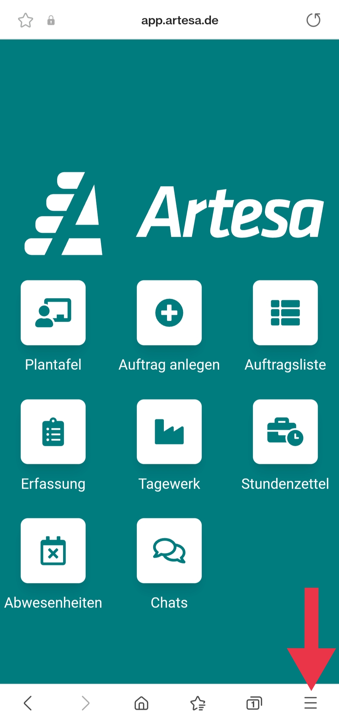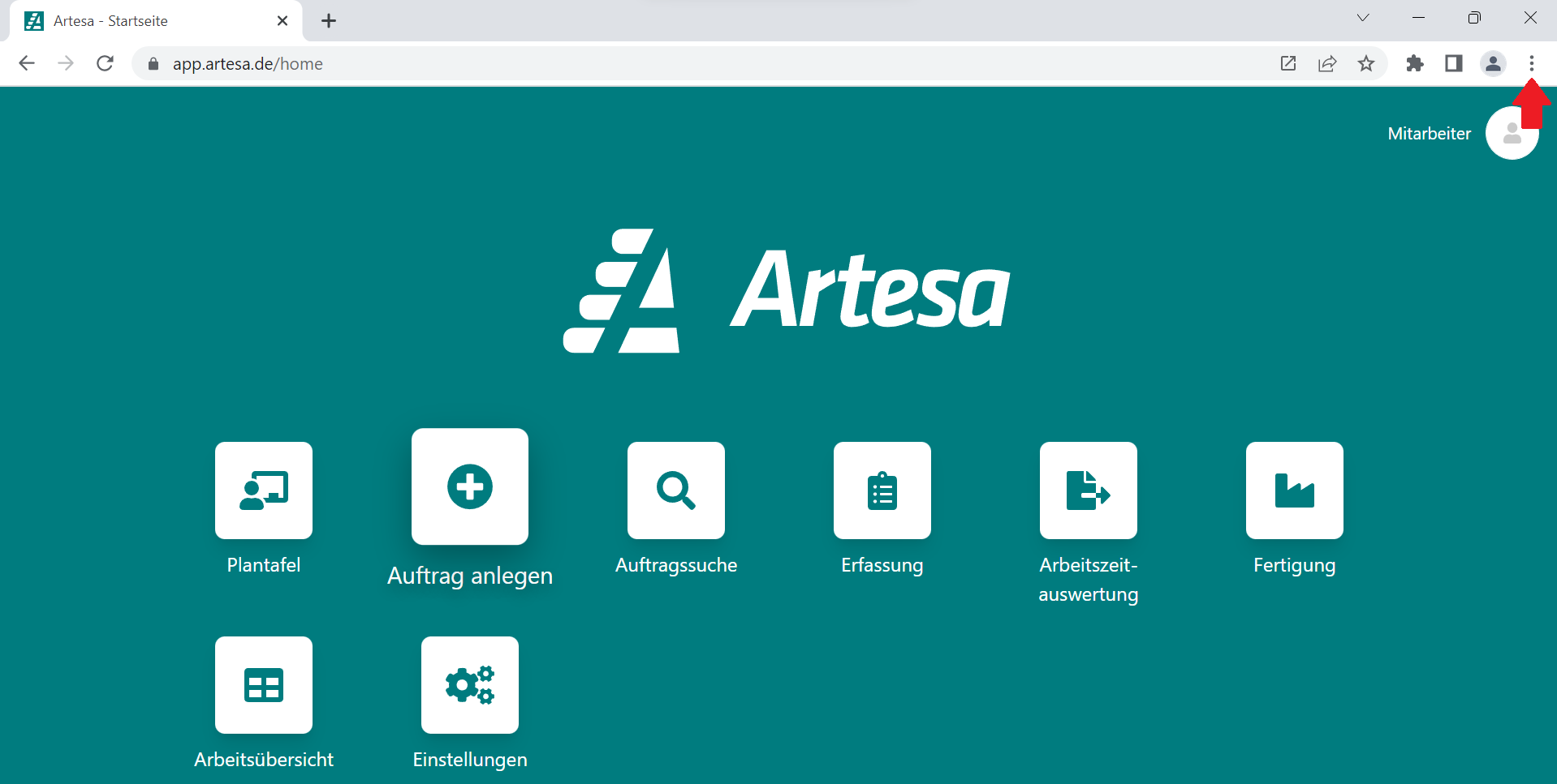 Um Artesa App mit Google Chrome zu installieren, öffne zuerst: app.artesa.de und melde dich mit deinen Kontodaten an.