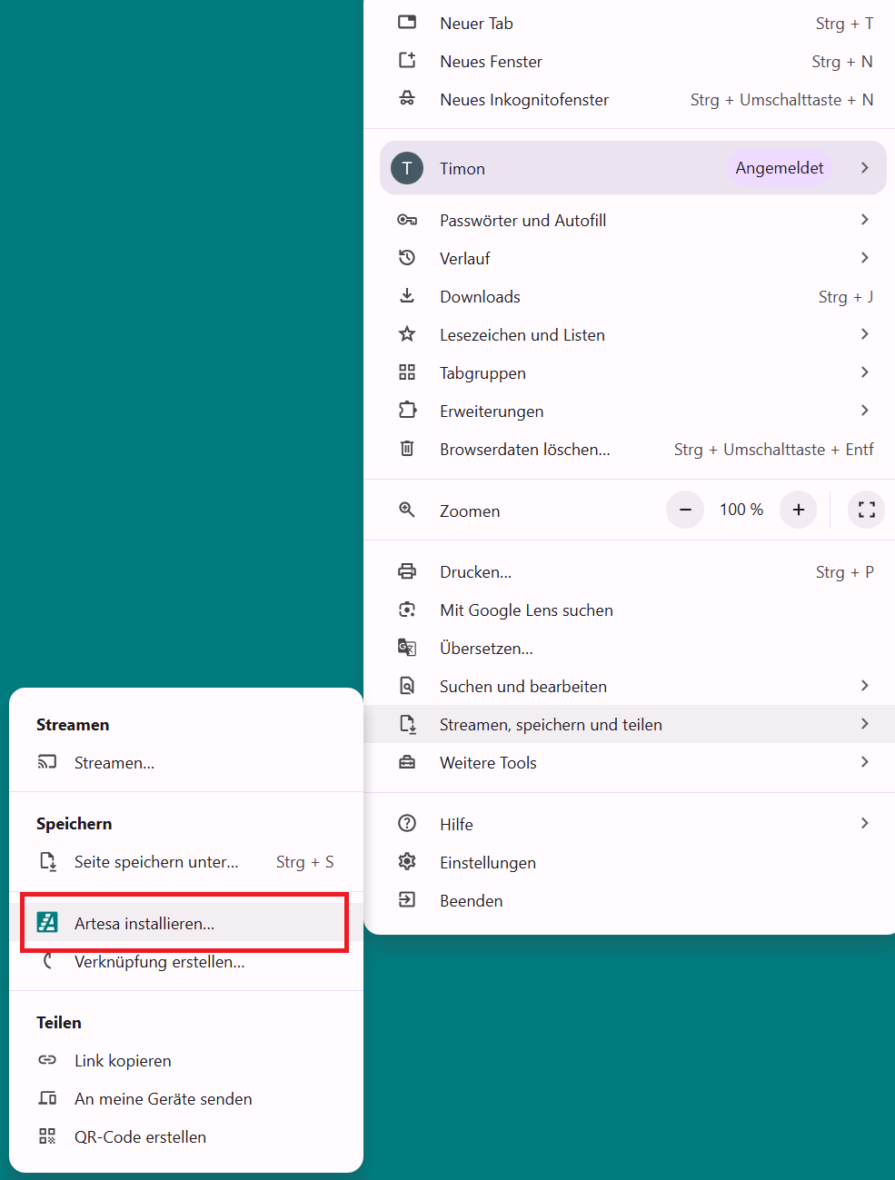 Bewege deine Maus im ausgeklappten Menü auf Apps, dort klappt ein weiteres Menü aus, indem du auf Installieren Sie Artesa klickst.