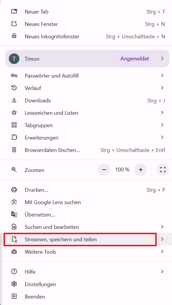 Im ausgeklappten Menü findest du den Punkt Streamen, speichern und teilen. Klicke diesen an.