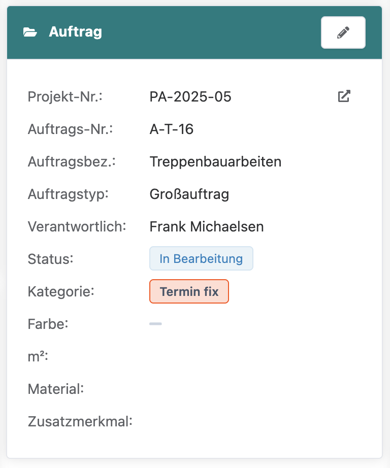 Wir haben die Auftragskategorien verschoben. Bisher waren sie in der Auftragsakte ganz oben. Nun sind sie konsequenterweise eingeordnet im Kärtchen "Auftrag".