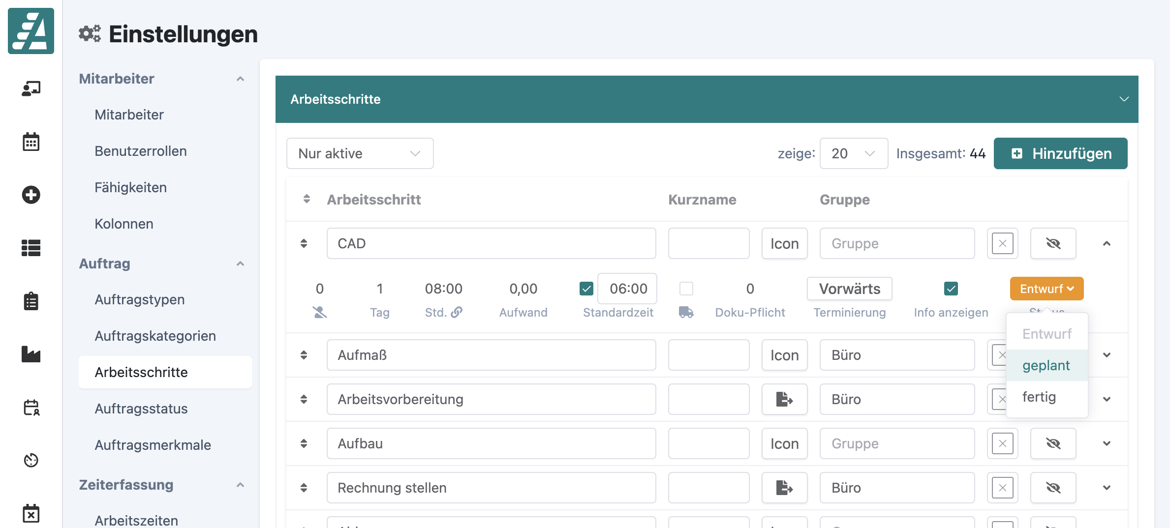 Neu hinzugefügte Arbeitsschritte haben immer den Status "Entwurf". Ab sofort kann man den Status auch automatisch auf "geplant" setzen lassen. Dies kann in den Einstellungen für Arbeitsschritte bzw. Standardabläufe festgelegt werden.