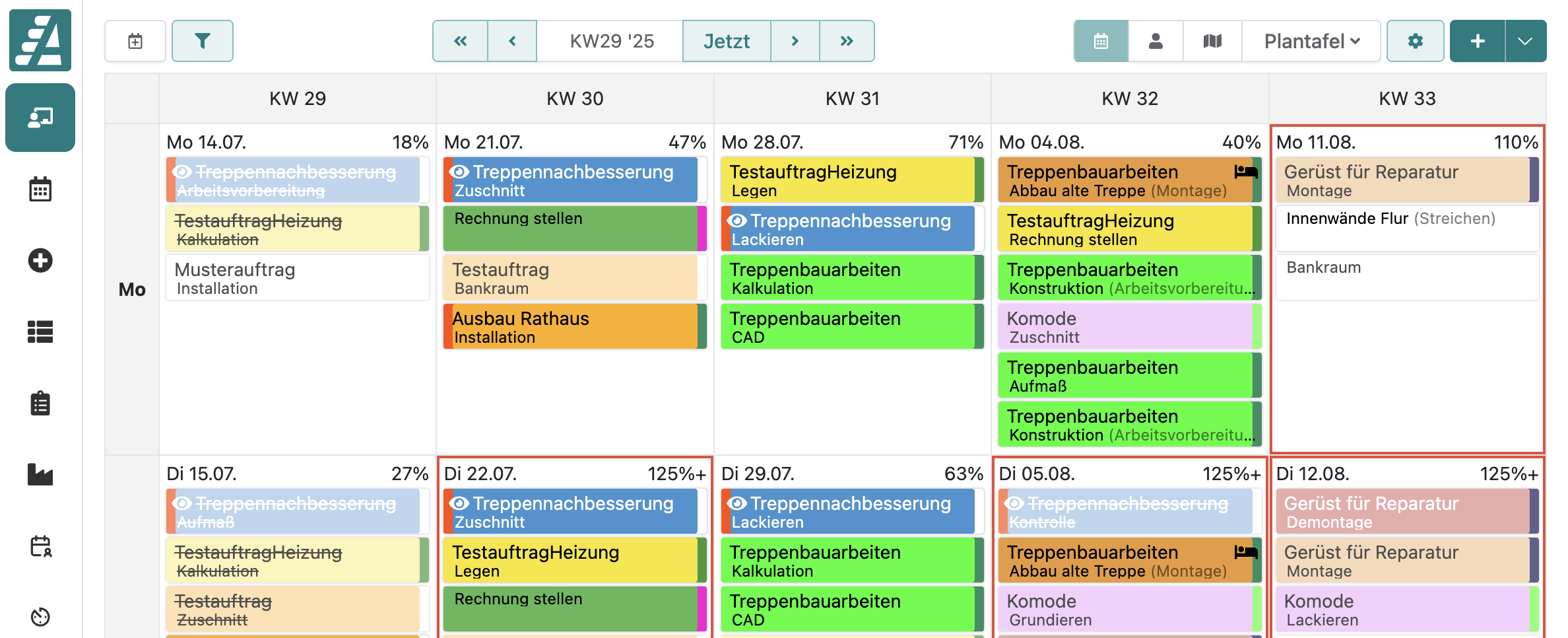 In unserer klassischen Plantafel werden Auftragskategorien und verantwortliche Mitarbeiter farblich hervorgehoben (linker und rechter Rand des Auftragskärtchens).