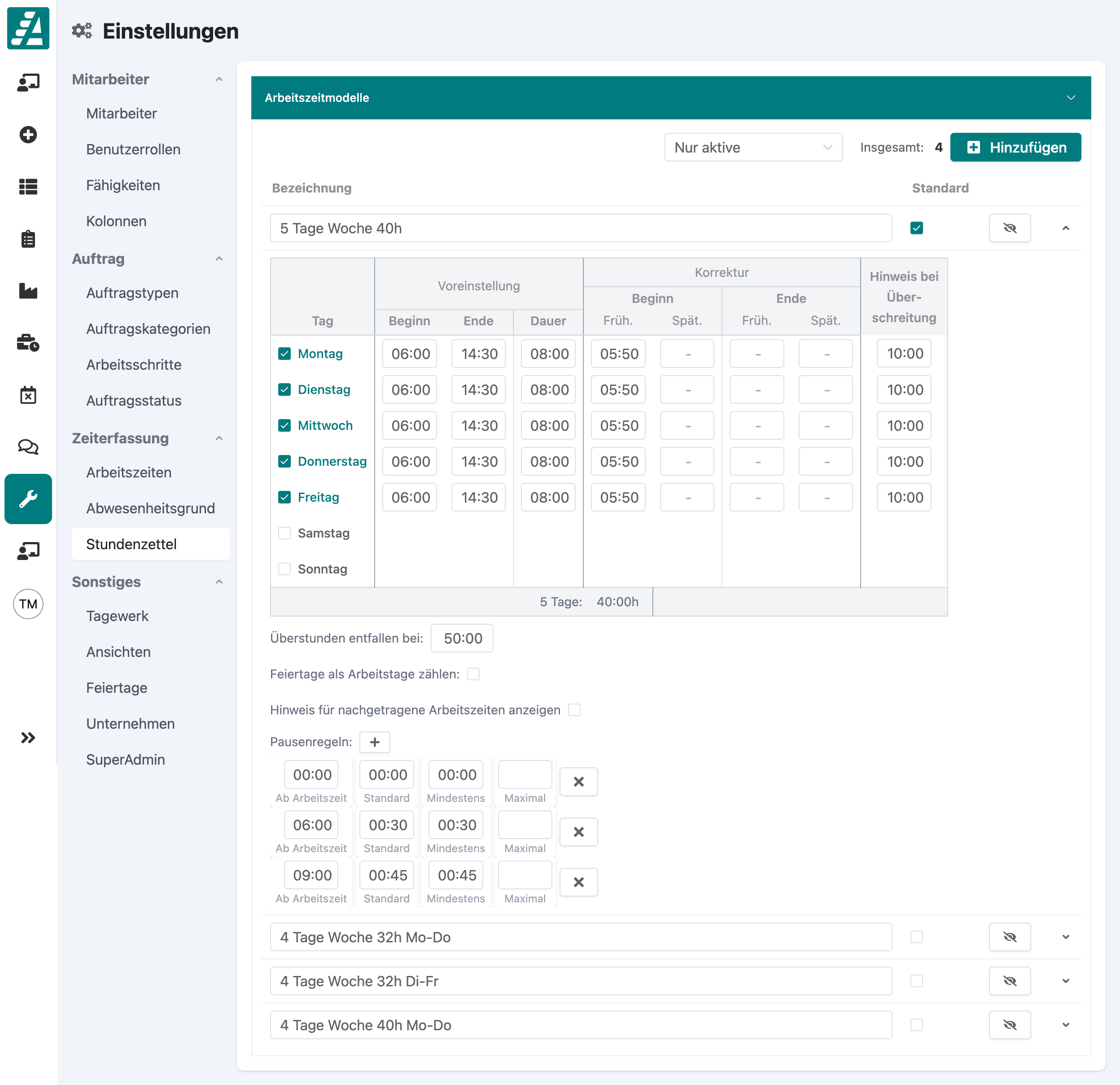 Ihr könnt jetzt Arbeitszeitmodelle anlegen. Sie vereinfachen die Zeiterfassung in den Stundenzetteln erheblich. Arbeitszeitmodelle sind sehr einfach zu benutzen, können aber ganz individuell festgelegt werden: Eine klassische 5-Tage-Woche mit 8 Stunden pro Tag ist genauso möglich wie eine 4-Tage-Woche mit 10 Stunden pro Tag. Da du für jeden Mitarbeiter ein eigenes Arbeitszeitmodell anlegen kannst, sind die Möglichkeiten nahezu unbegrenzt.