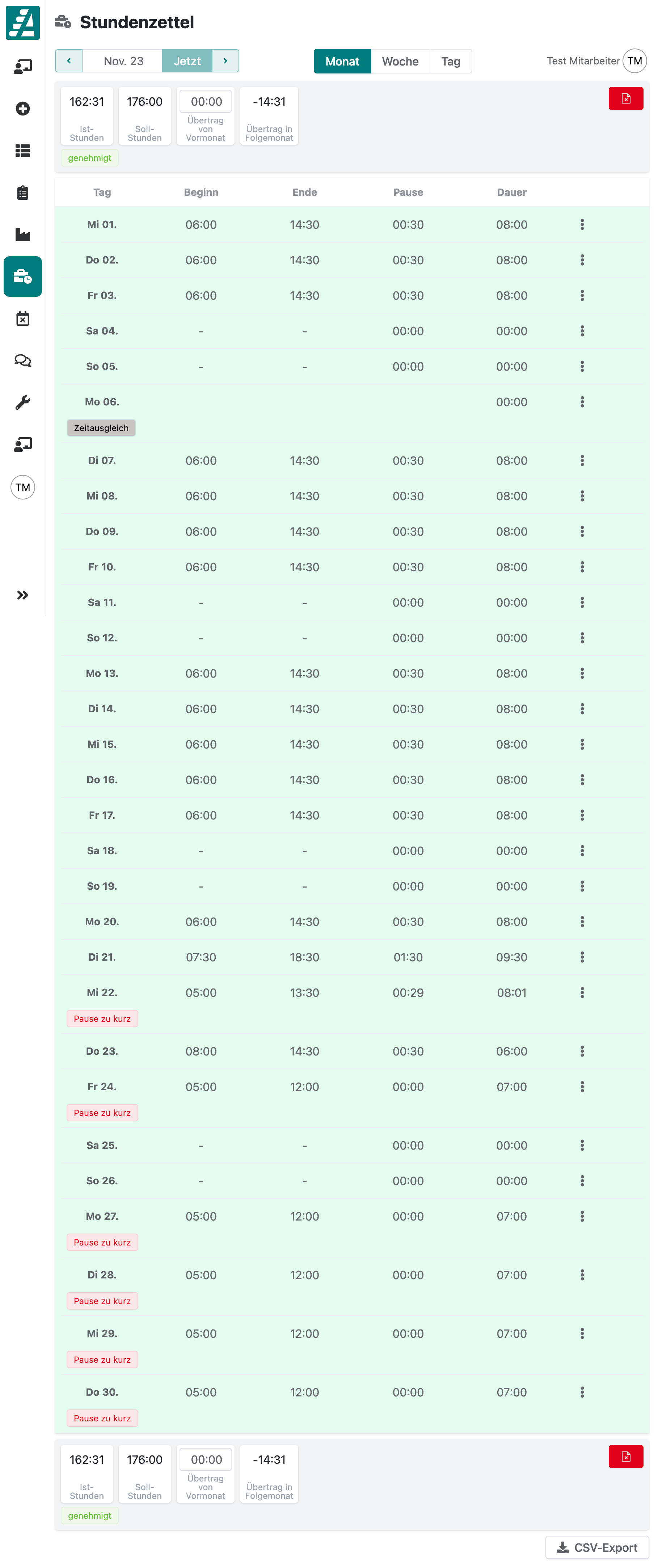 Die Monatsansicht eignet sich am Ende des Monats, um alle Arbeitszeiten abschließend zu kontrollieren, den Stundenzettel zu genehmigen und diesen dann als CSV-Datei zu exportieren.