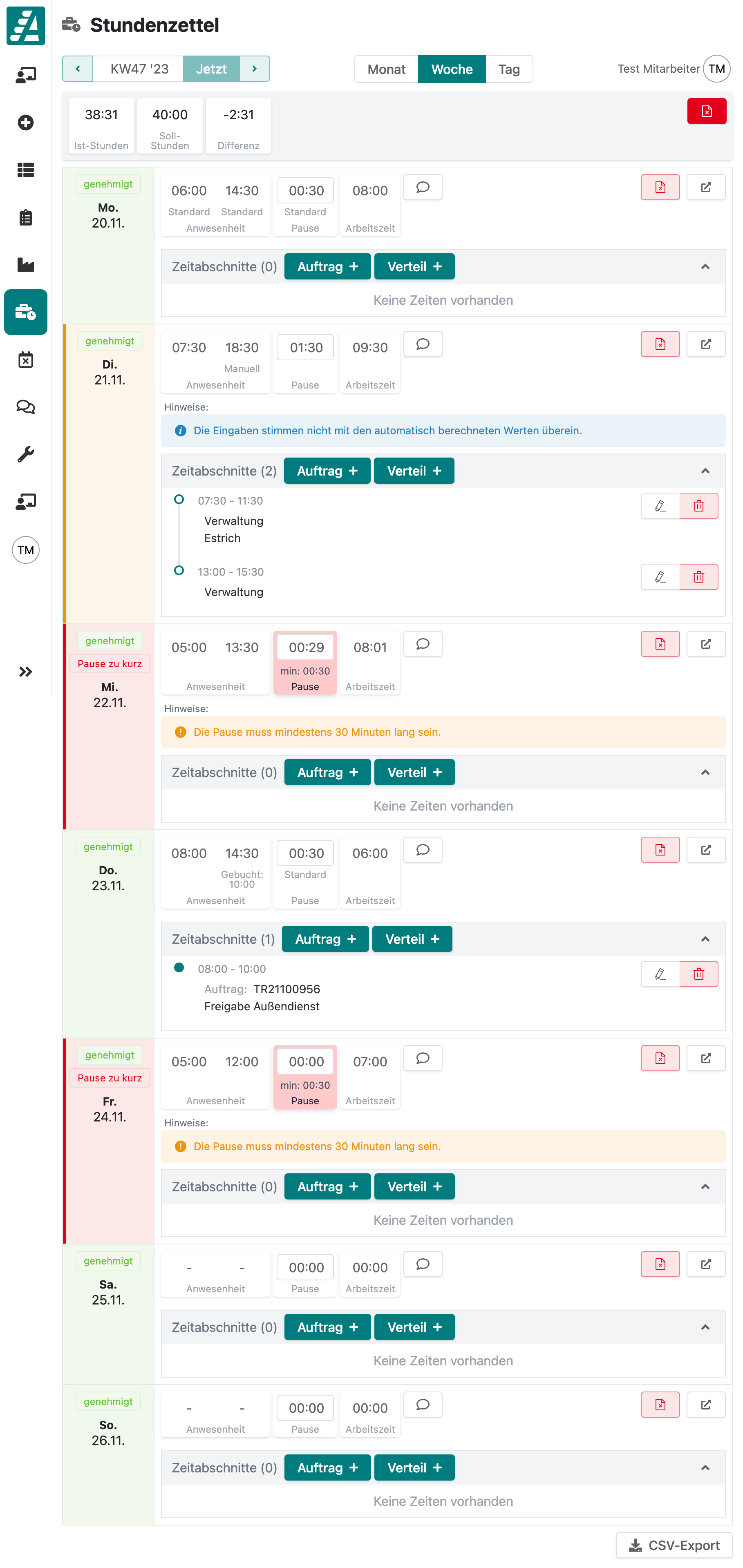 In der Wochenansicht kannst du die Arbeitszeiten der Mitarbeiter für die jeweilige Woche überprüfen und die Wochen-CSV-Datei exportieren.